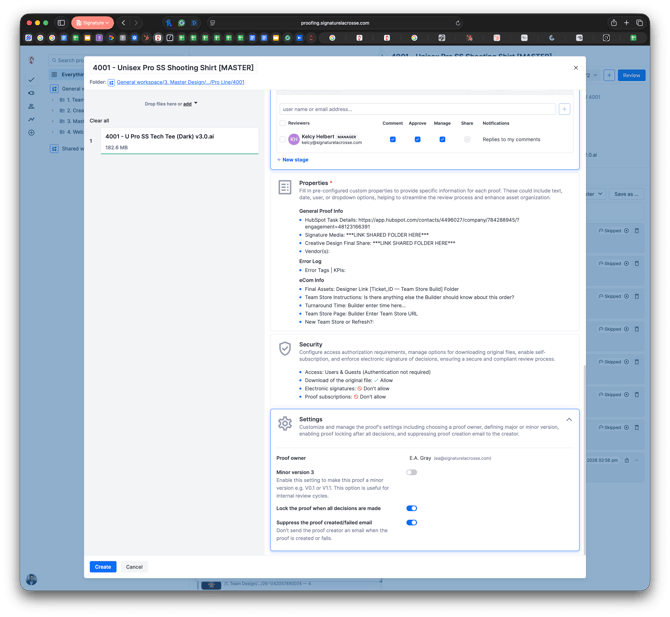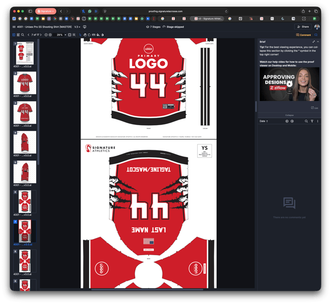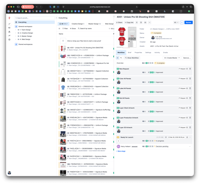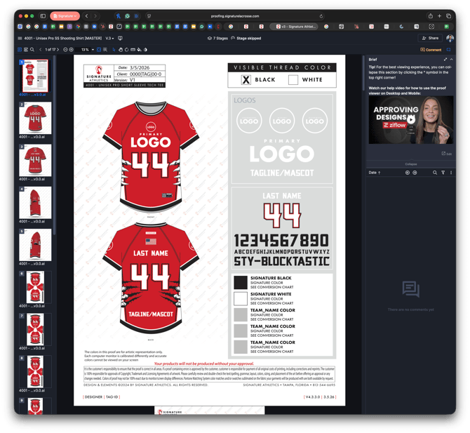 - Upload the Versioned (e.g., "4001 - U Pro SS Tech Tee (Dark) v3.0" to Ziflow (e.g., "4001 - Unisex Pro SS Shooting Shirt [MASTER] Proof").