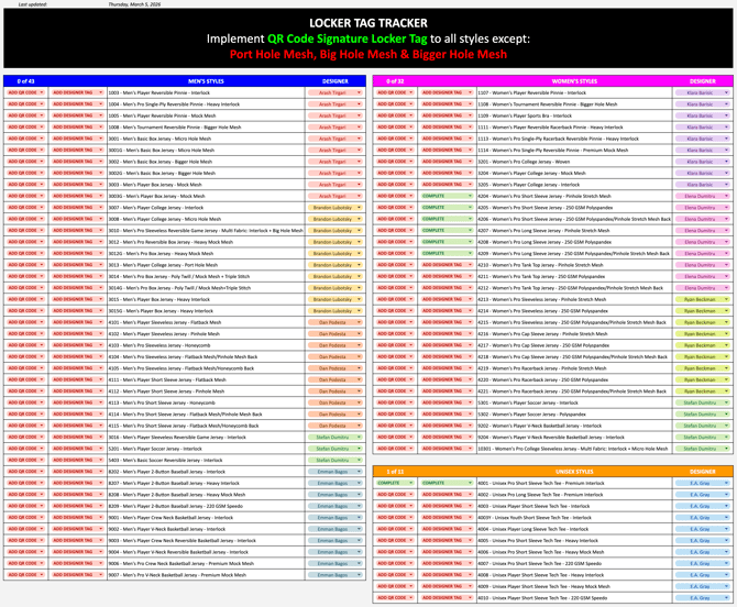 This guide provides a thorough, step-by-step process for designers to update Signature Locker styles by replacing the old locker tag with the new QR Code version or adding it where missing. The update applies to 86 styles (43 Men's, 32 Women's, and 11 Unisex), divided among 9 designers for efficiency.